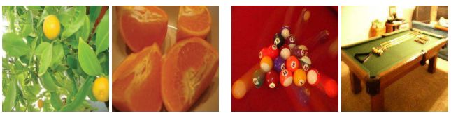 这是ImageNet的另一个具有挑战性的特性:同一个类的对象可以看起来很不一样。 让我们看看下面的图片。左边的两个都来自“orange”类,右边的两个都来自“pool table”类。 然而,每一对图像看起来都不一样!对于人类,我们可以看到其中一个桔子被切开,另一个桔子没被切开。 我们也可以看到一张桌子的图片放大了,另一张没有放大。这就是所谓的类内差异性。 我们希望尽量减少这种变化,因为我们希望在我们的深度学习模型中,同一类的两幅图像看起来是相似的。