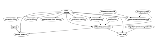 如果你不知道从哪一个主题开始,怎么办呢?为了解决这个问题,我们标注了哪些主题是其他主题的先决条件;你应该学习哪些主题来更好地理解一个给定的主题。我们的图表的一部分如下所示:
