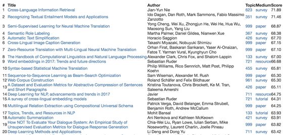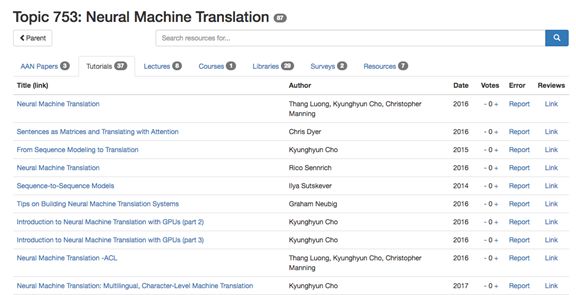 TutorialBank是一个人工收集的数据库,它包含了NLP,人工智能(AI),机器学习(ML)和信息检索(IR)等相关领域的约6,500条资源。几年来,我们精选了与这些领域相关的优质资源。其中包括了surveys, tutorials, libraries, codebases等。我们觉得除了学术论文之外,学生们还从阅读教程(tutorials)中学到很多东西,所以我们专注于论文以外的资源。对于每个资源,我们使用元数据来填充数据库(比如论文中所述的资源类型),并根据我们自己对300多个主题的分类方法对每个资源进行分类。这些主题涵盖了广泛的领域,从基础数据结构、算法到数学和语言学,以及在深度学习、机器翻译和强化学习等方面的最先进的技术。下面列出了一些主题:
