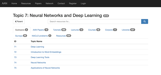 非常容易!我们创建了一个搜索引擎,我们称之为“All About NLP”(AAN),你可以使用它来快速搜索我们的语料库(访问语料库)。缩写AAN来自于ACL Anthology Network语料库(可以通过文章【4】和文章【5】来了解)。我们将我们的新搜索引擎与来自ACL Anthology Reference Corpus【6】的超过24000篇论文整合在一起,并不断用新资源更新我们的搜索引擎。你可以浏览我们的资源分类,并通过单击“Browse Resources by Topic:”选择你正在查找的资源类型: