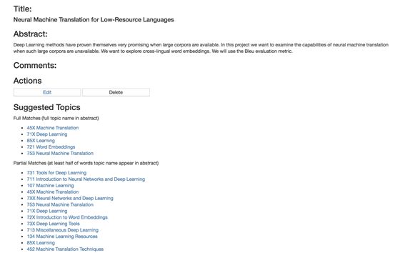 我们网站的另一个令人振奋的功能是基于标题和摘要对来推荐资源。通常情况下,你可能会被指派一项任务,或者对一个项目有一个早期的想法,并且需要找到资源来推进你的想法。基于这个出发点,我们想为你推荐一些资源来完成你的项目,比如编写一个由tutorial组成的参考书目。要使用此功能,请访问Dashboard【7】(需要登录)并单击“Public Projects”以查看示例,或者点击“My Projects”创建你自己的项目。除了来自我们语料库的相关资源列表之外,我们还推荐基于文本匹配的分类主题。我们计划通过探索标题和抽象对之间的关系来改进当前的baseline。示例输出如下: