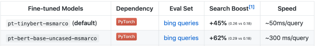TinyBERT,虽然不如BERT Base有效,但我们的实验表明,它保留了BERT Base MRR分数的90%(0.26与BM25排名前50位的0.29对比0.29,而使模型快10倍,小20倍)。但是,基于学术基准(例如MS Marco)的结果通常缺乏现实世界的可概括性,因此应谨慎考虑。