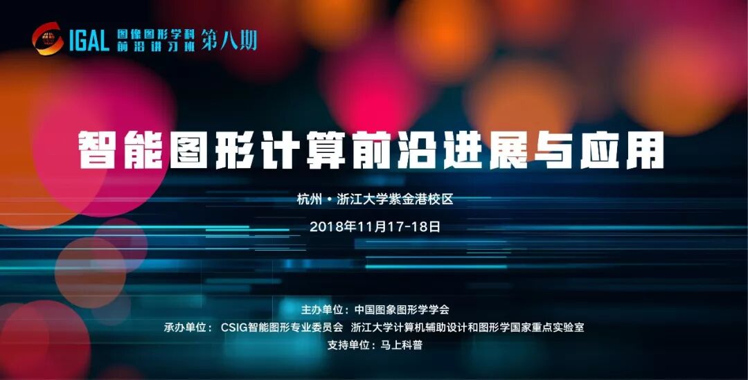 第8期CSIG图像图形学科前沿讲习班(Advanced Lectures on Image and Graphics,简称IGAL)于2018年11月17日-18日在杭州举办,本期讲习班的主题为“智能图形计算前沿进展与应用”,由浙江大学周昆教授任学术主任,邀请智能图形计算及相关领域的知名专家作报告,使学员在了解学科前沿,提高学术水平的同时,增强与国内外顶尖学者的学术交流。