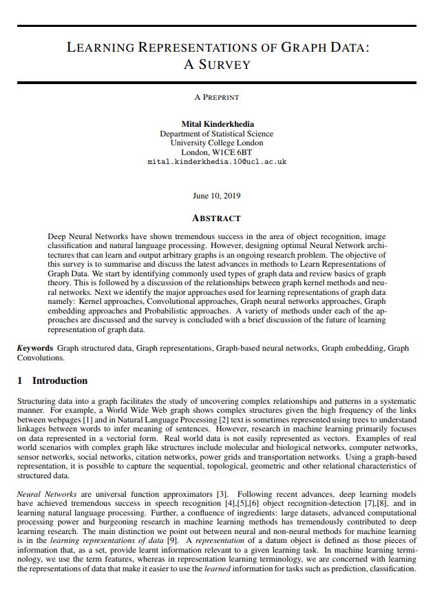 本文总结和讨论学习图数据表示方法的最新进展,包括核方法、卷积方法、图神经网络方法、图嵌入方法和概率方法等。