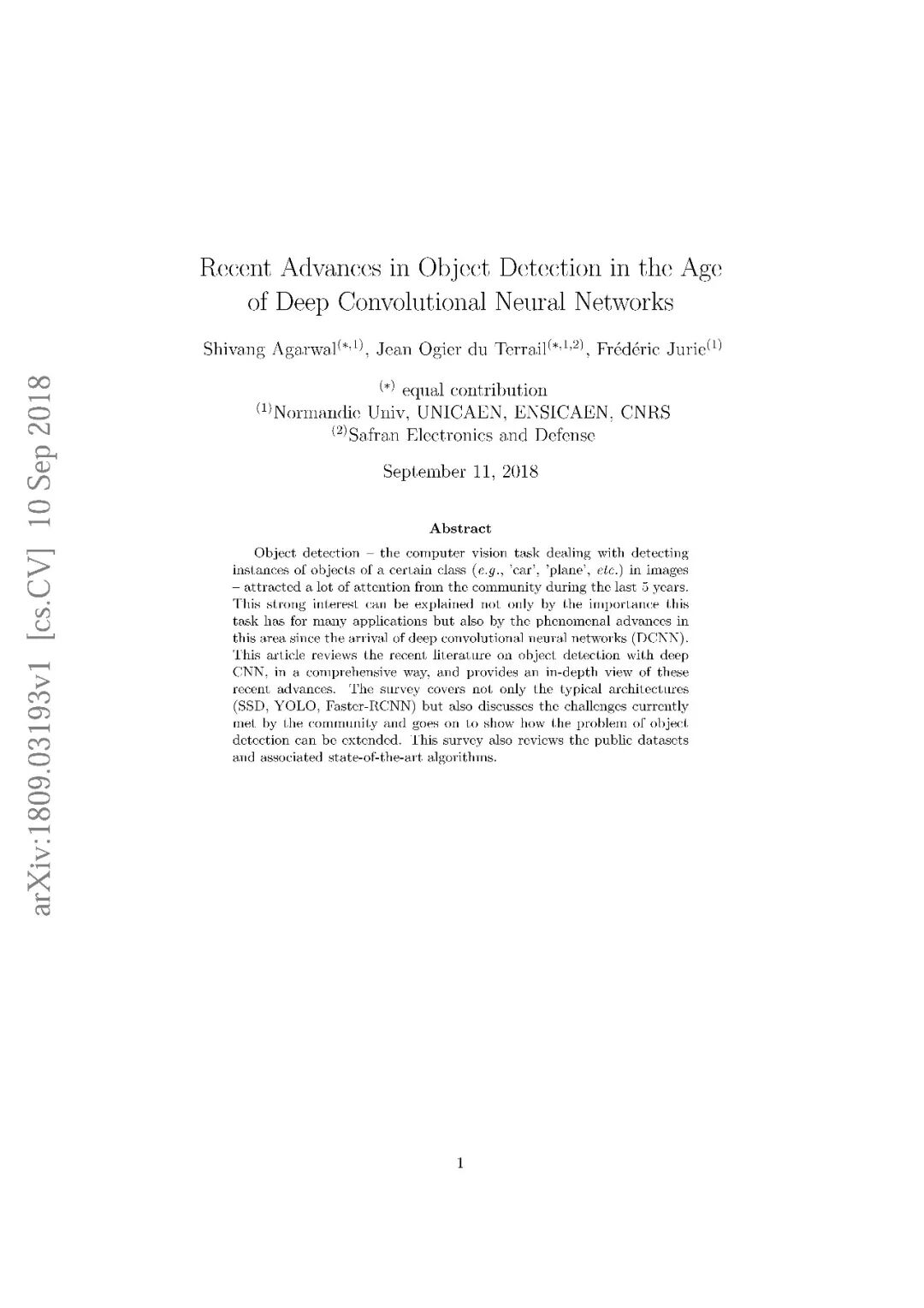 【导读】目标检测 -是计算机视觉的经典问题,在现实场景中有很多重要应用。最近法国Frederic Jurie等人发表了一篇关于基于深度CNN的目标检测最新论文,详细叙述了近期有关CNN深度物体检测的文献,并对这些最新进展进行了深入分析。该综述不仅涵盖了典型的架构(SSD,YOLO,Faster-RCNN),还讨论了社区当前遇到的挑战,并展示了如何扩展对象检测问题。该综述展示了了公共数据集和相关的最新算法。