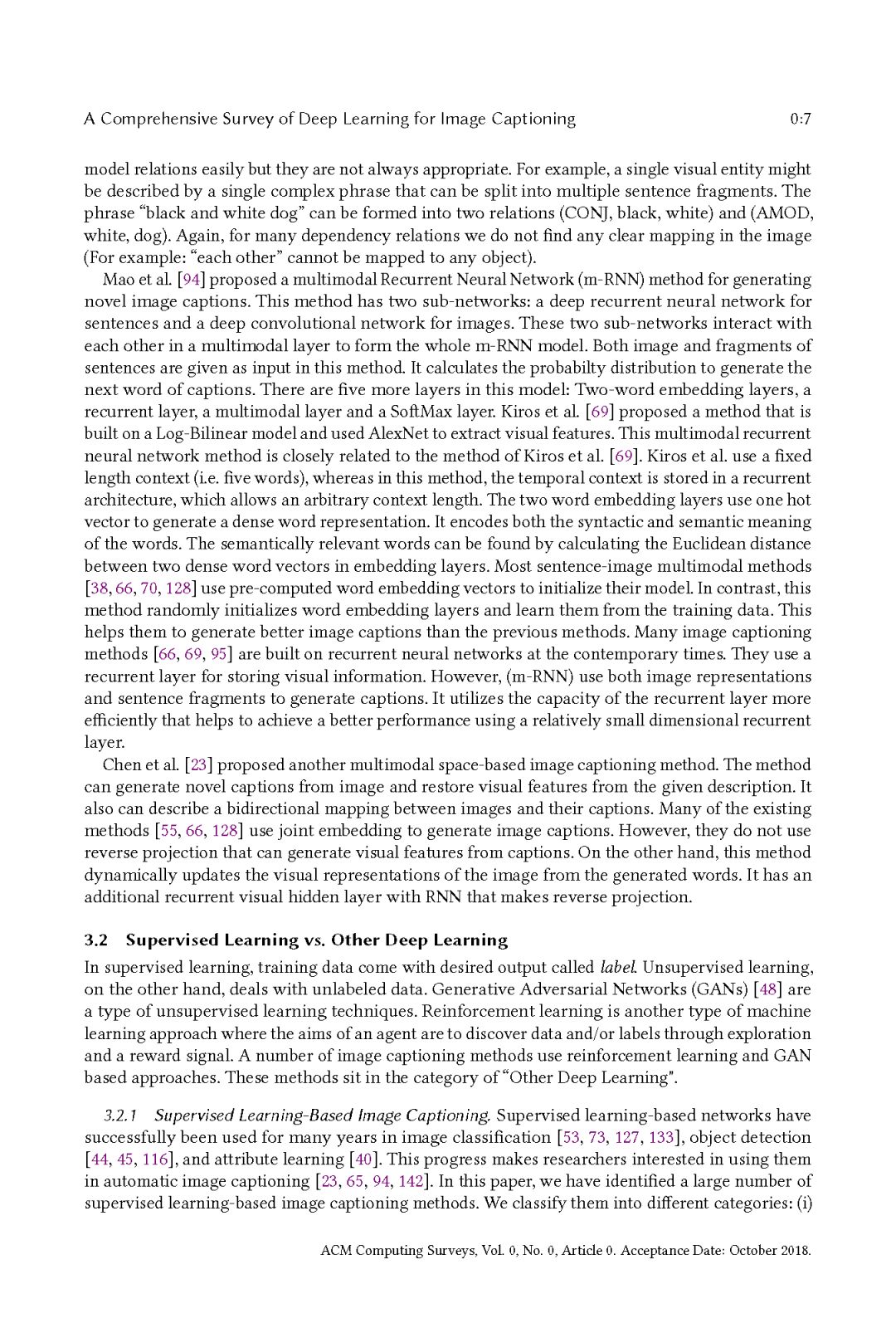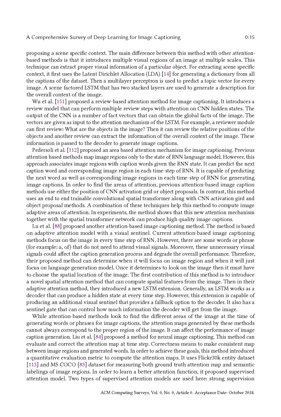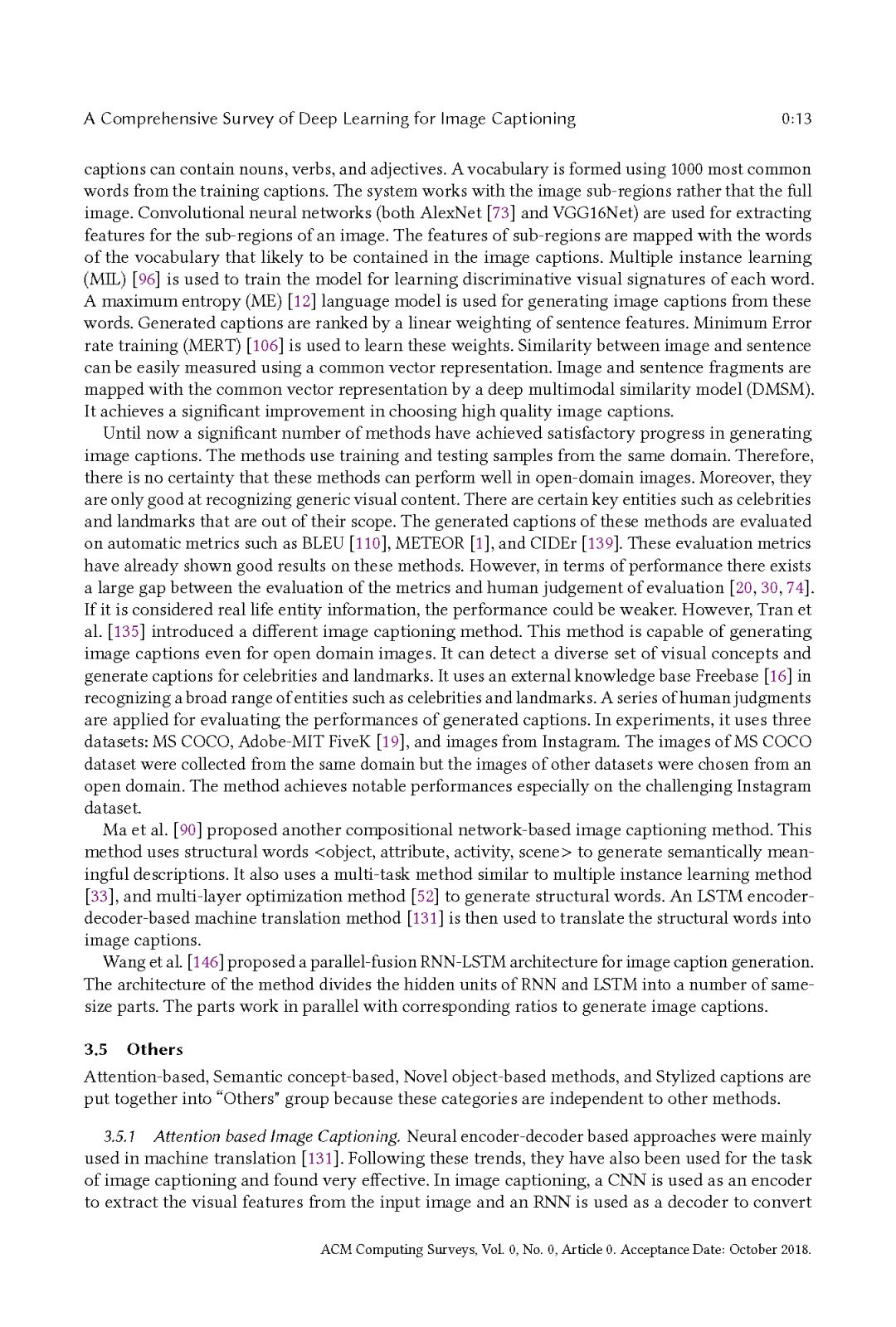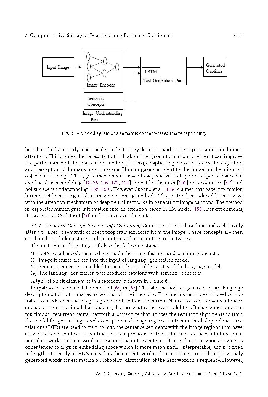 其次, 论文将基于深度学习的图像描述生成方法分为不同的类别,即1)基于视觉空间,(2)基于多模态,(3)监督学习,(4)其他深度学习,(5) Dense captioning, (6)基于整个场景, (7)基于Encoder-Decoder体系结构, (8)基于组合体系结构, (9)基于LSTM(长短期记忆的语言模型, (10)基于其他语言模型, (11)基于注意力,(12)基于语义概念,(13)Stylized captions等等。