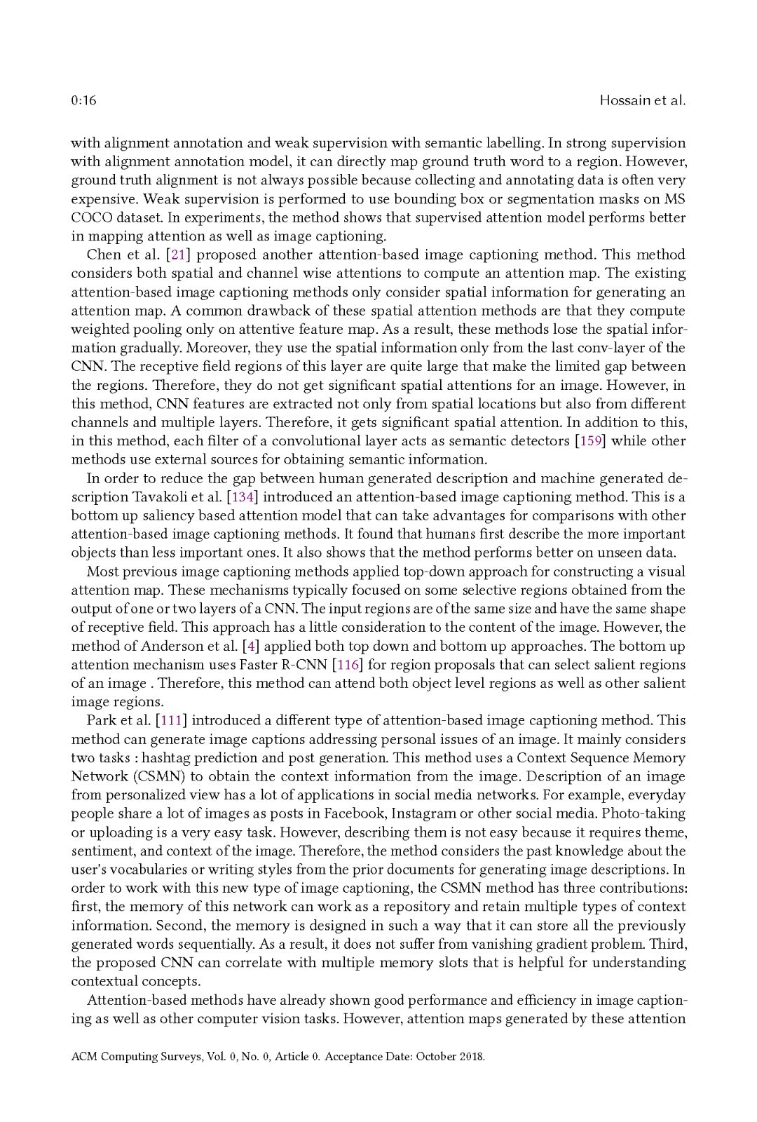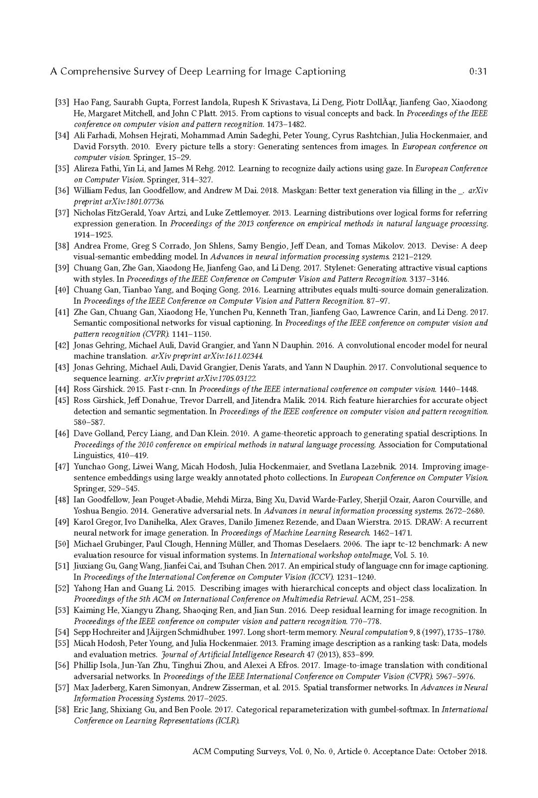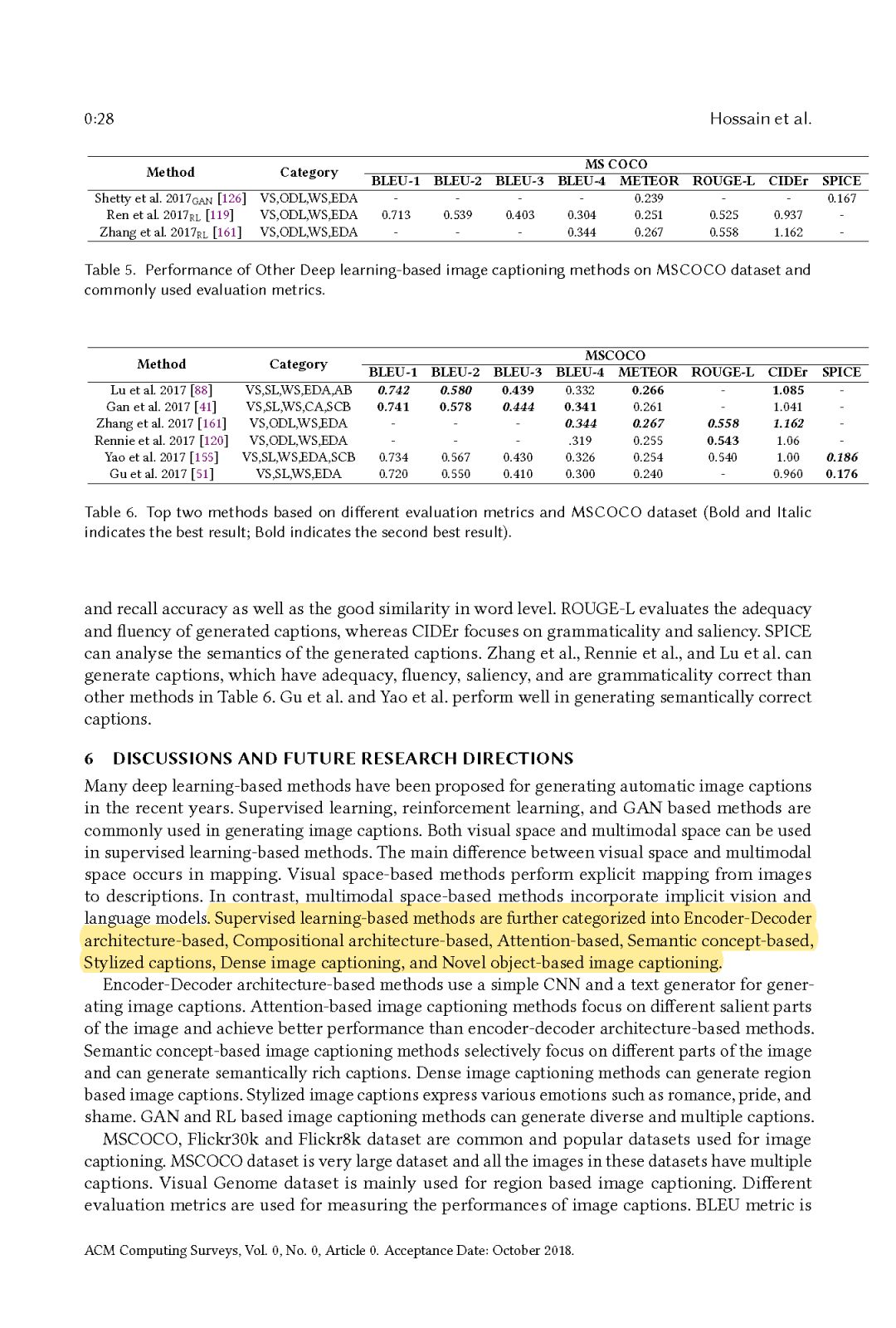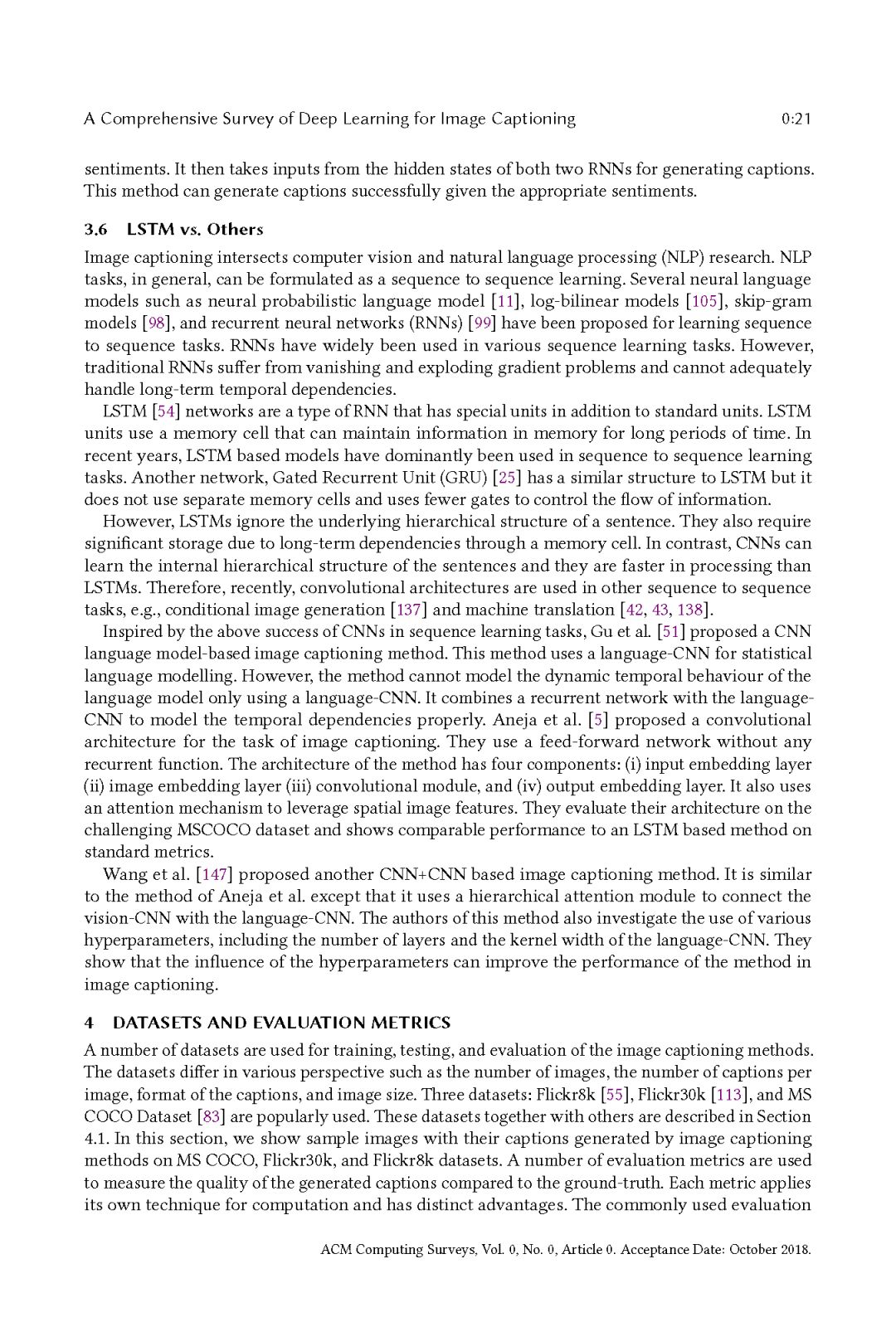 其次, 论文将基于深度学习的图像描述生成方法分为不同的类别,即1)基于视觉空间,(2)基于多模态,(3)监督学习,(4)其他深度学习,(5) Dense captioning, (6)基于整个场景, (7)基于Encoder-Decoder体系结构, (8)基于组合体系结构, (9)基于LSTM(长短期记忆的语言模型, (10)基于其他语言模型, (11)基于注意力,(12)基于语义概念,(13)Stylized captions等等。