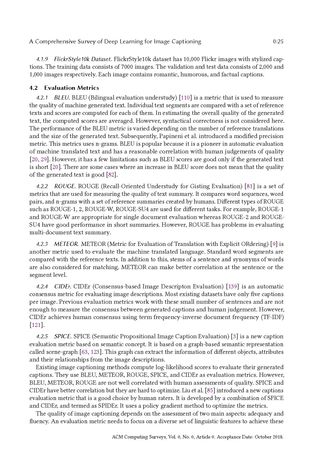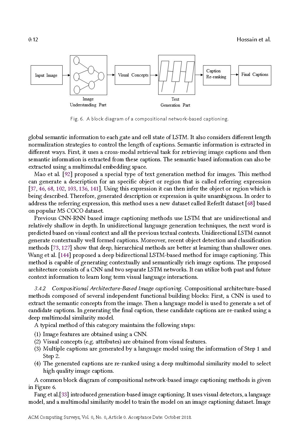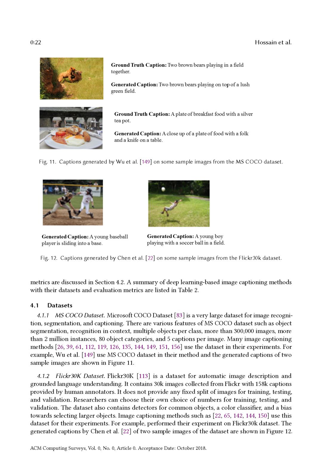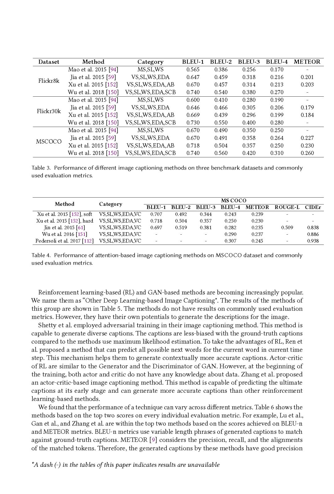 近5年来,大量关于深度学习图像描述生成的文章被广泛使用。深度学习算法能够很好地处理图像描述生成的复杂性和一系列挑战。到目前为止,只有三篇关于这个方向的综述论文(8,13,75,见论文)发表。虽然这些论文对图像描述生成进行了很好的文献综述,但由于大部分论文只覆盖少量关于深度学习的论文。这些综述论文主要讨论了基于模板、基于检索、基于深度学习的图像描述生成模型。然而,在基于深度学习的图像描述生成方面,研究者们已经做了大量的工作,并且还有好多新数据集的使用,当前暂时还没有一个全面的图像描述生成的综述。