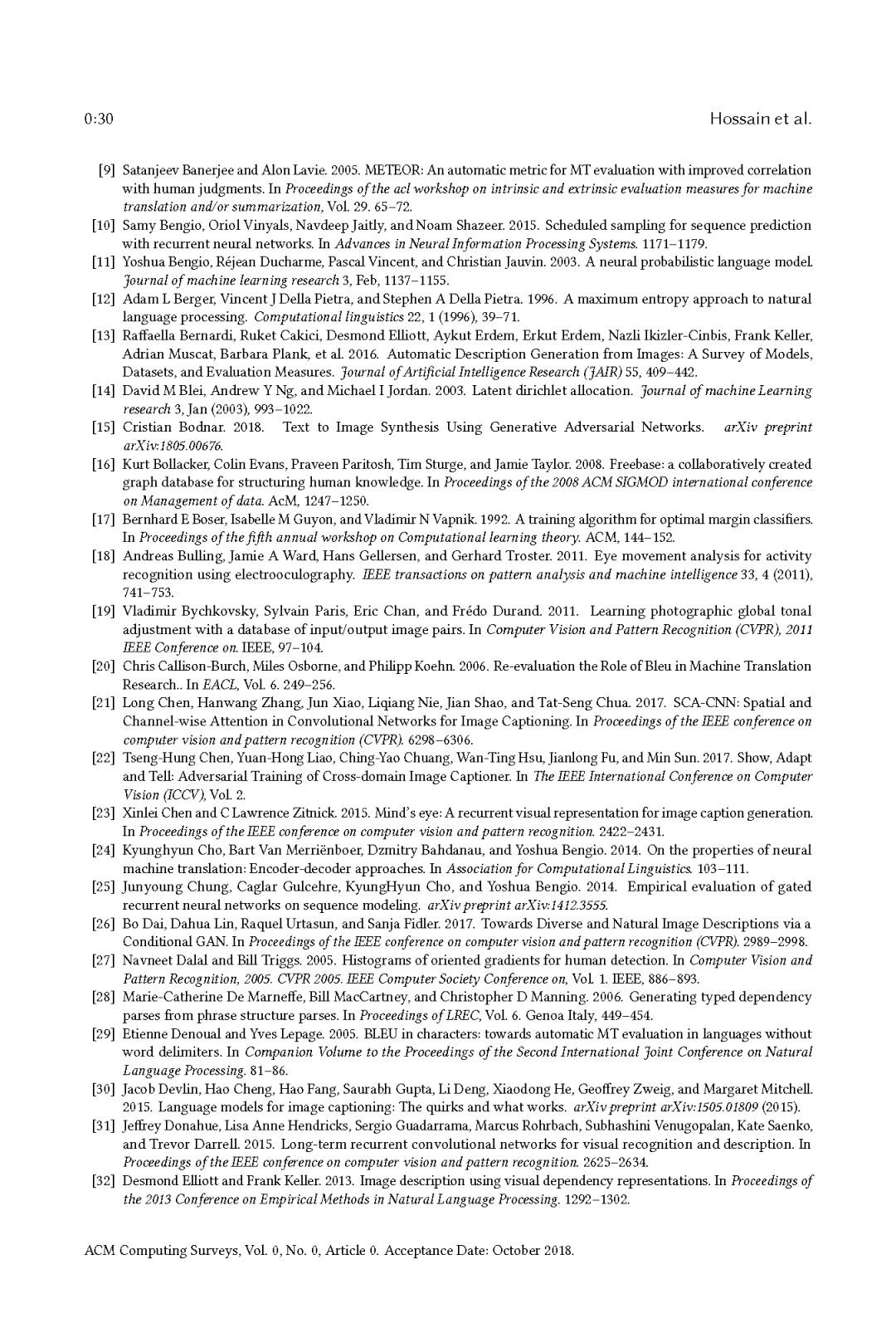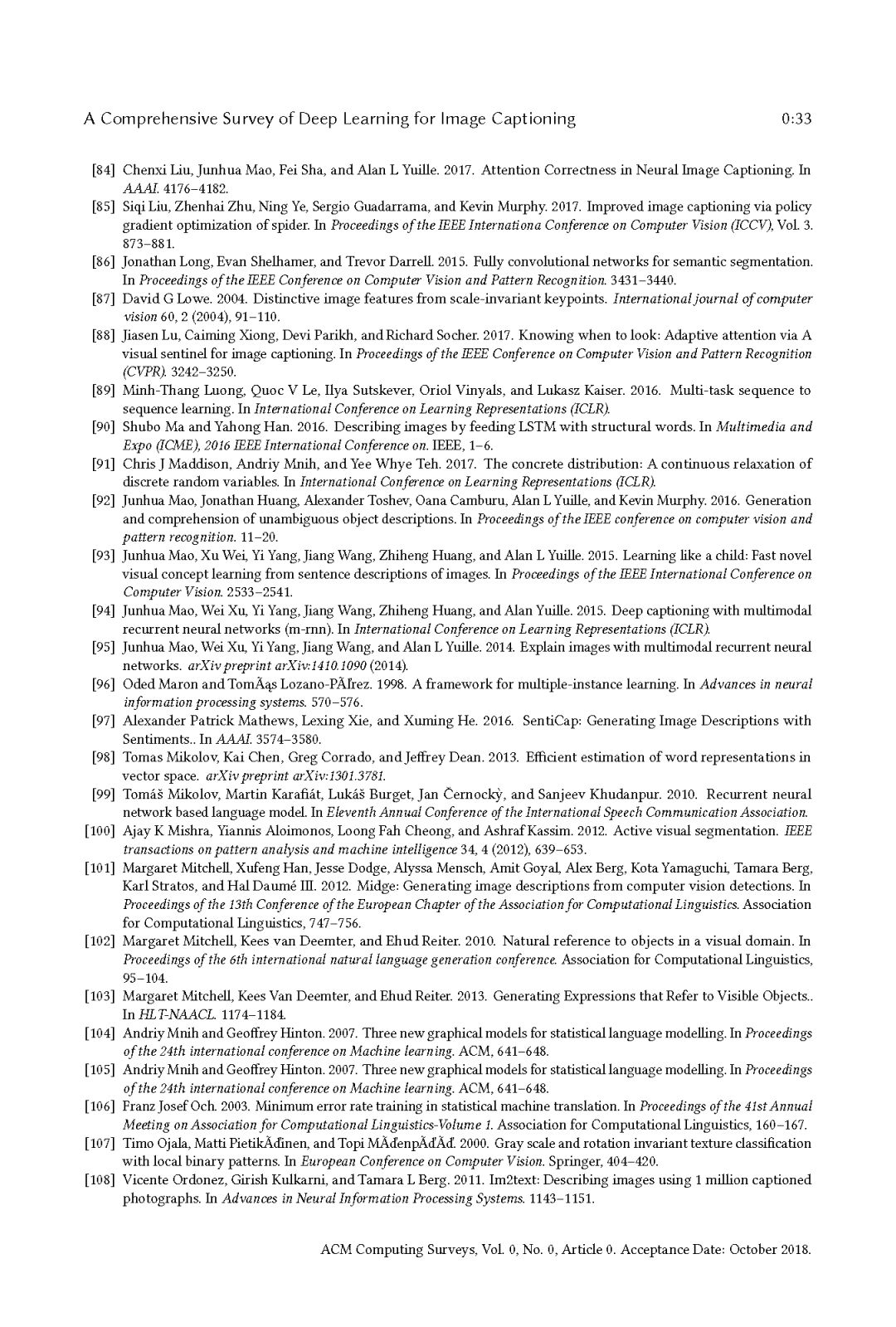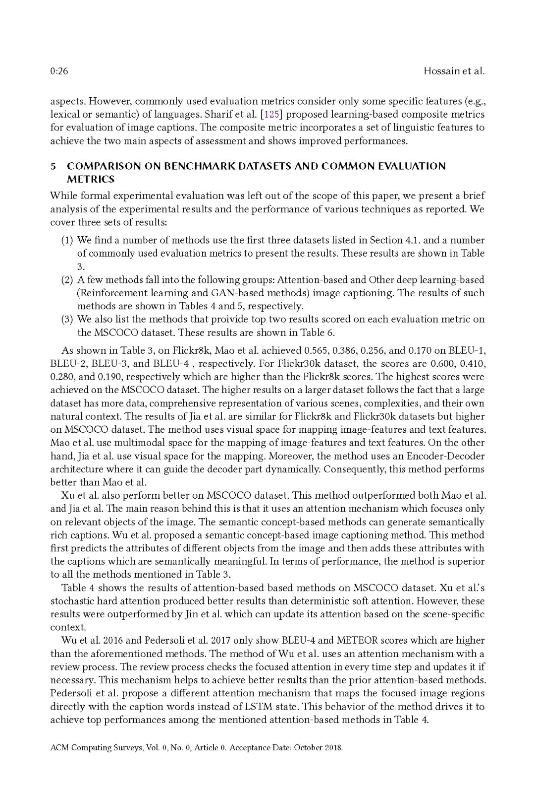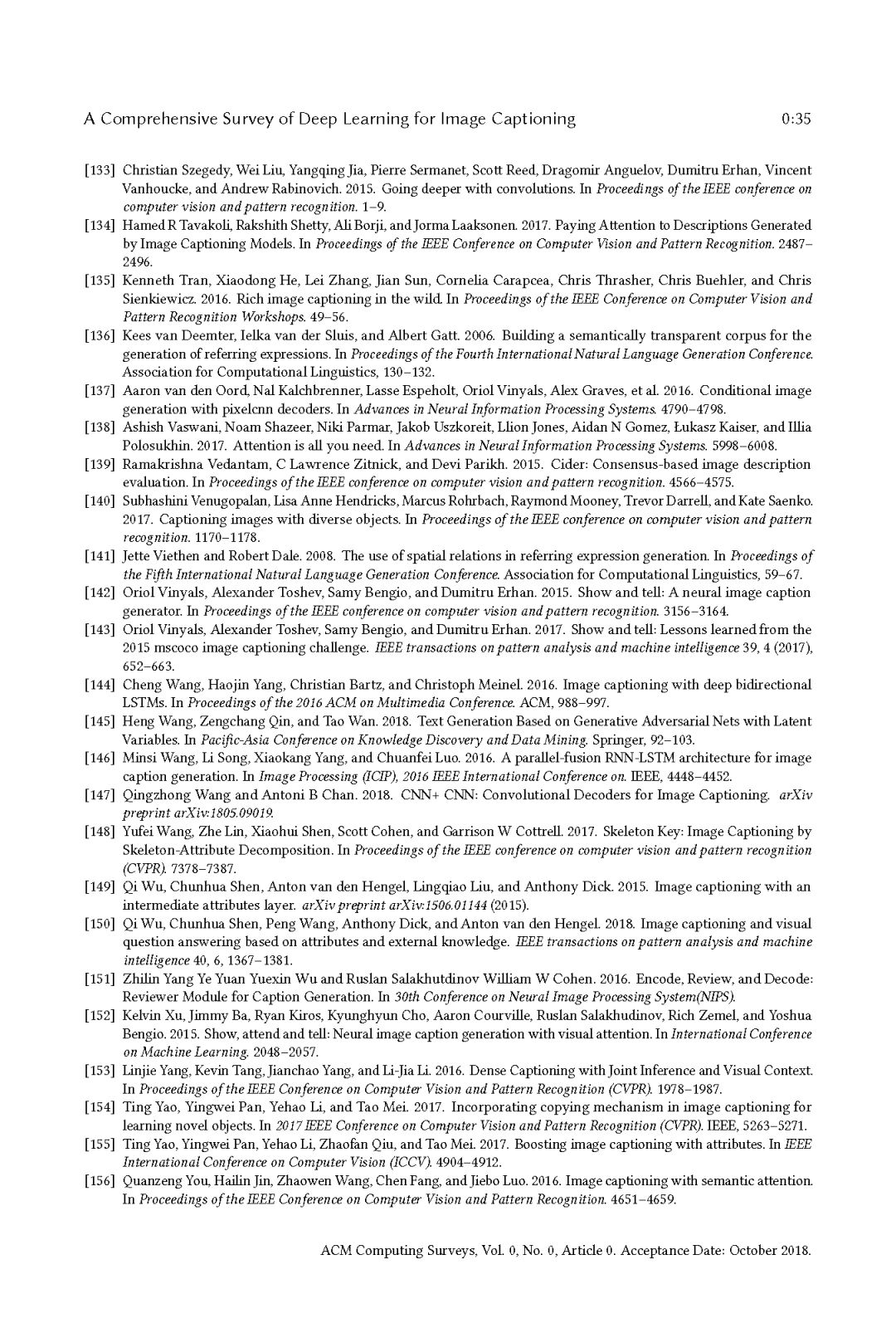 近5年来,大量关于深度学习图像描述生成的文章被广泛使用。深度学习算法能够很好地处理图像描述生成的复杂性和一系列挑战。到目前为止,只有三篇关于这个方向的综述论文(8,13,75,见论文)发表。虽然这些论文对图像描述生成进行了很好的文献综述,但由于大部分论文只覆盖少量关于深度学习的论文。这些综述论文主要讨论了基于模板、基于检索、基于深度学习的图像描述生成模型。然而,在基于深度学习的图像描述生成方面,研究者们已经做了大量的工作,并且还有好多新数据集的使用,当前暂时还没有一个全面的图像描述生成的综述。