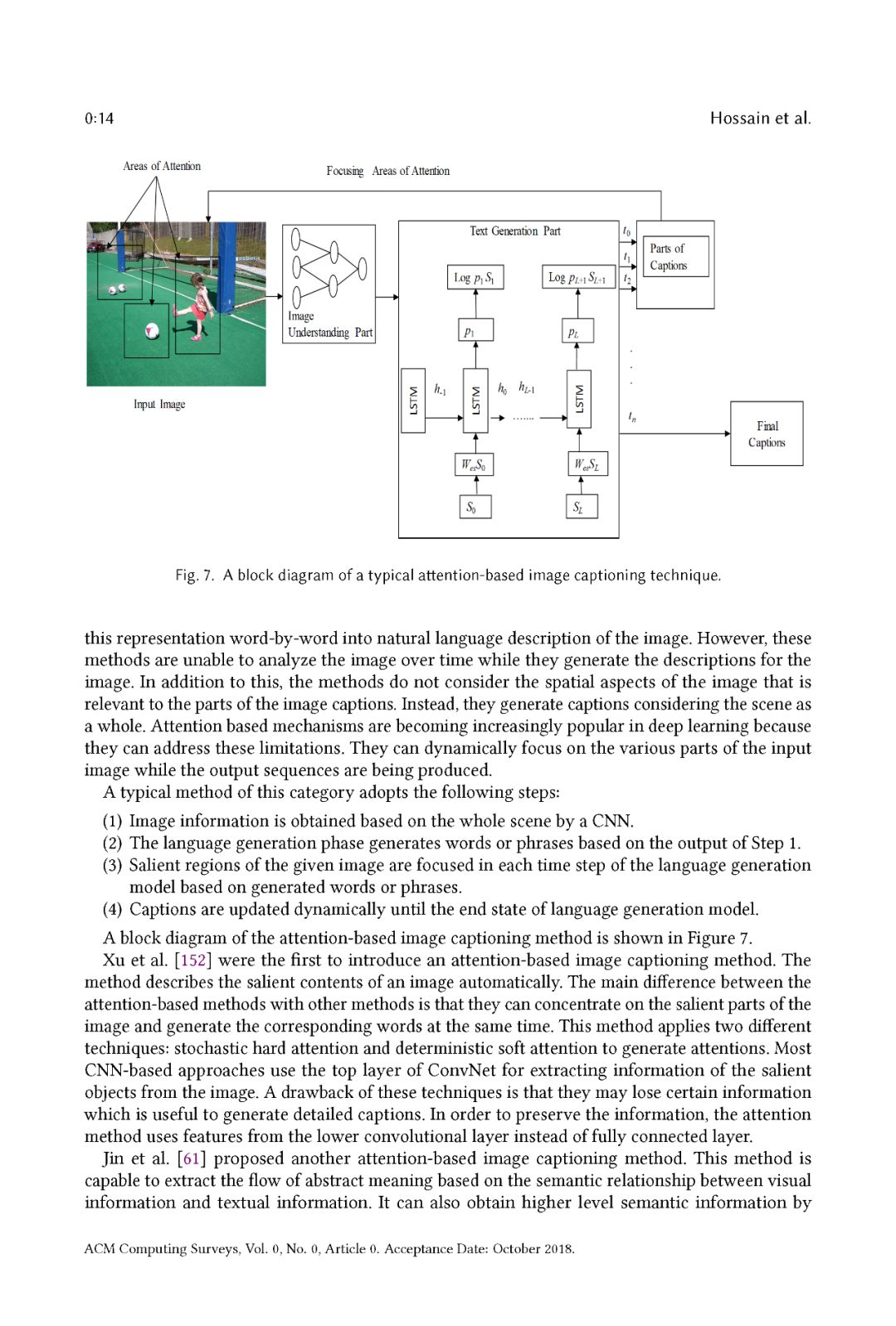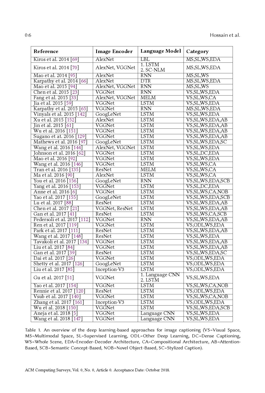 这些类别将在文章中第2节中进行简要讨论。大多数基于深度学习的图像描述生成方法都属于第三类别。这篇综述只关注基于深度学习的图像描述的生成。