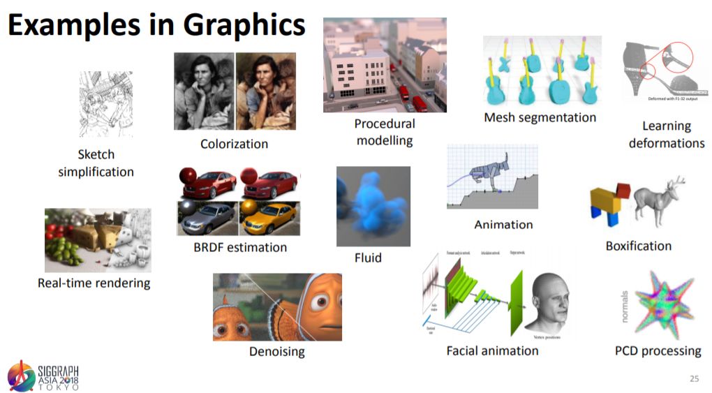 计算机图形学中的问题:包括特征检测、去噪平滑、嵌入距离计算、渲染、动画、物理仿真、生成式模型