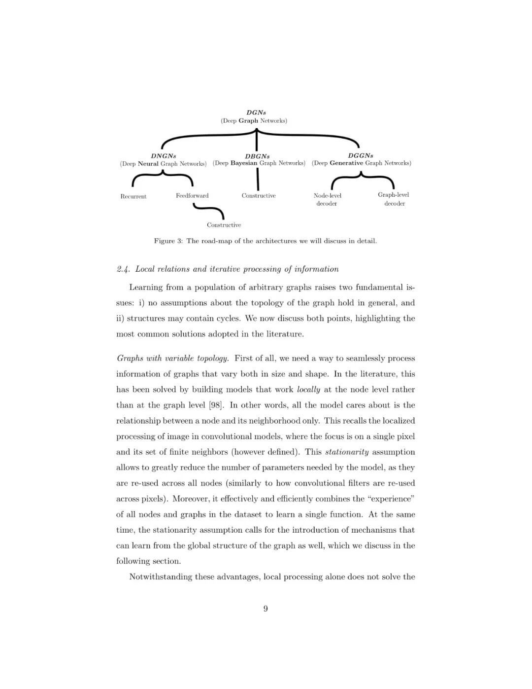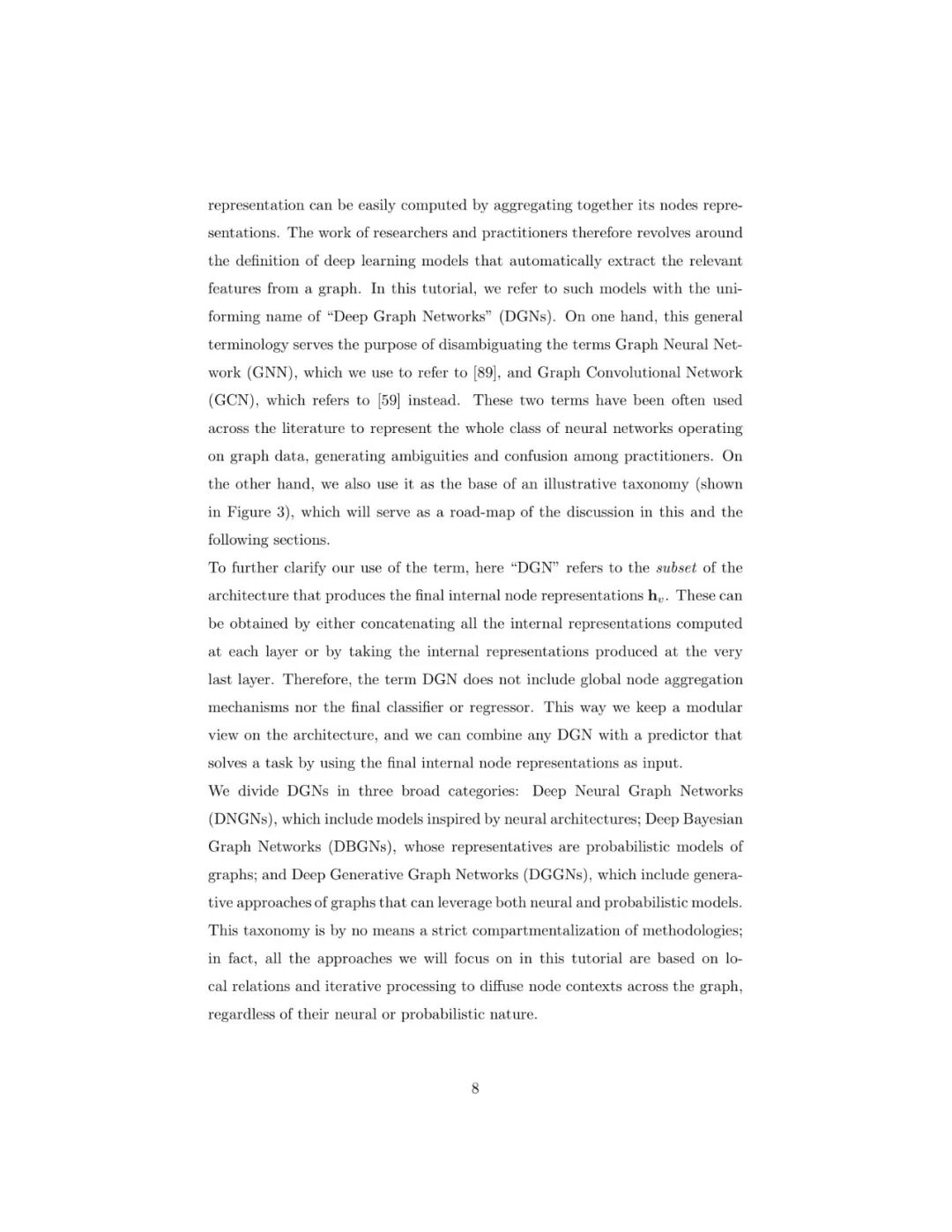 教程在介绍概念和想法时采用了自上而下的方法并保留了清晰的历史观点,为此,导论在第2节中提供了图表示学习的泛化形式,将图表示学习泛化为一种基于局部和迭代的结构化信息处理过程。同时,介绍了架构路线图,整个导论也是围绕该路线图进行开展的。导论聚焦于面向局部和迭代的信息处理过程,因为这些过程与神经网络的体系更为一致。因此,导论会淡化那些基于图谱理论的全局方法(假设有一个固定的邻接矩阵)。