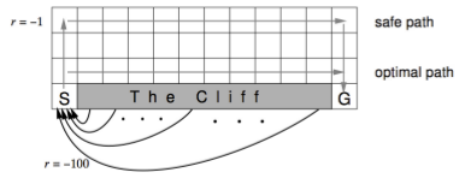 下面以一个悬崖行走格子世界环境为例,讲解如何使用通用的格子世界环境类来得到自己想要的格子世界环境对象。悬崖行走的例子出现在David Silver强化学习公开课的 第五讲 ,环境如下: