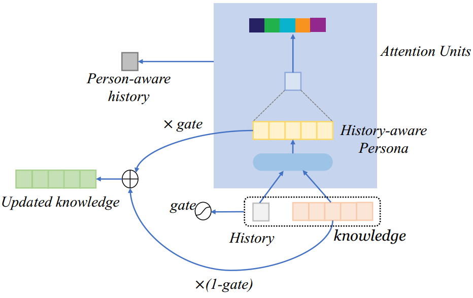 在History-adaption 层,追踪外部知识在对话中的状态对于保持对话的一致性和重复性是重要的。对于外部知识的控制和更新和对话历史是紧密相关的。基于此,我们设计了一个门机制来控制外部信息在对话中的流动。我们循环的更新外部知识同时将其融入到历史中增强对话历史信息,最后我们采用层次循环机制捕捉基于外部知识感知的对话历史信息。