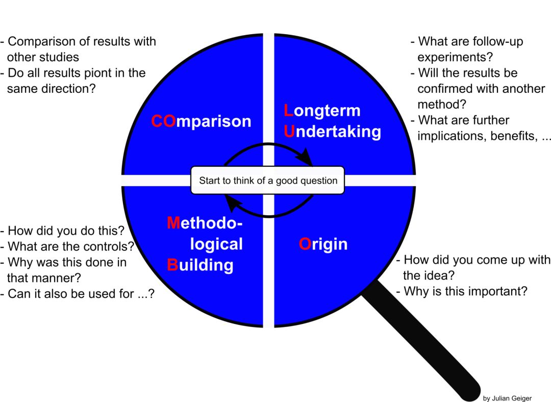 【导读】提问是最好的学习,应该把参加学术讨论看成不可多得的学习良机,而提问则是充分把握新知识的钥匙。 罗斯基勒大学Julian Geiger 根据自己的经历总结了几种提问的“套路”,不但能让你提出好的问题更能让你获得深入的思考,建议学术新手收藏学习。