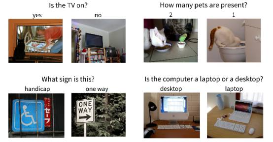 比较常用的数据集就是 VQA 这个数据集,来自 Gatech 和微软。目前VQA数据集已经更新到v2.0版本,其中包括204721个COCO图像,大于1.1 million个问题,大于11 million个答案。V2.0版本中每个问题有两个相似的图像,并且有不同的答案,如下图所示: