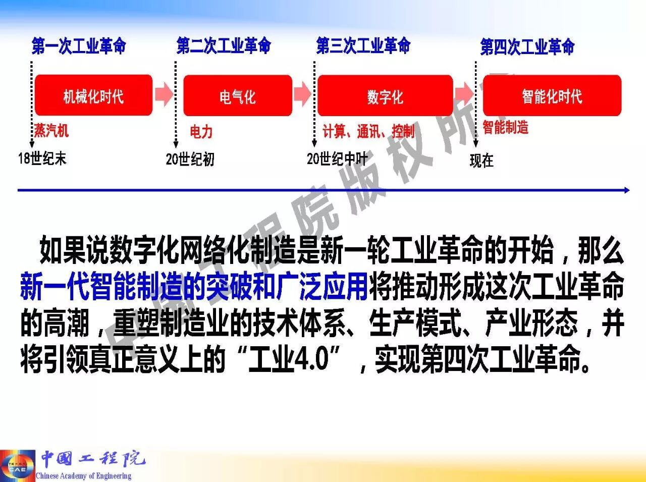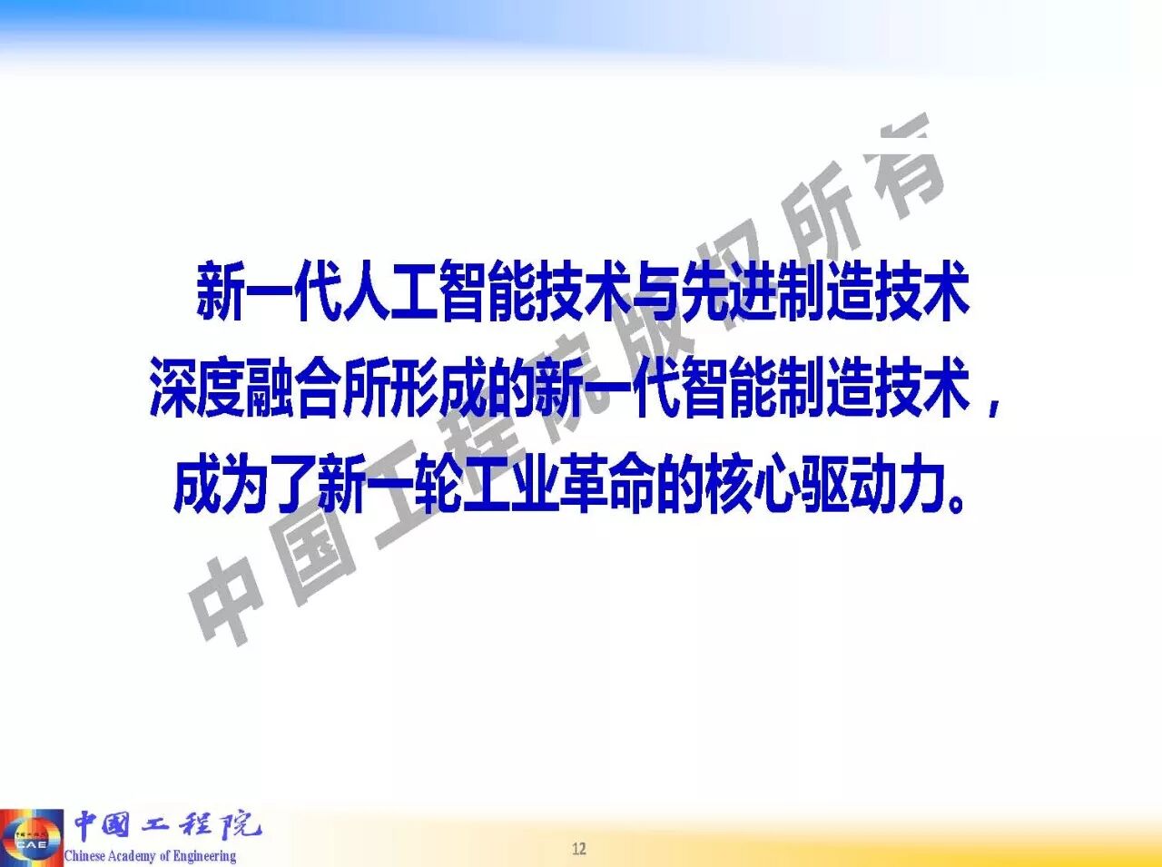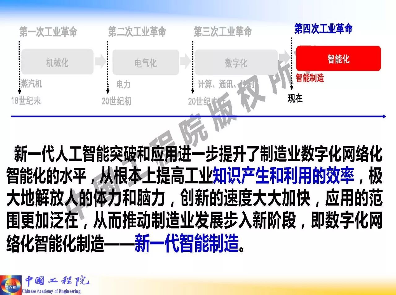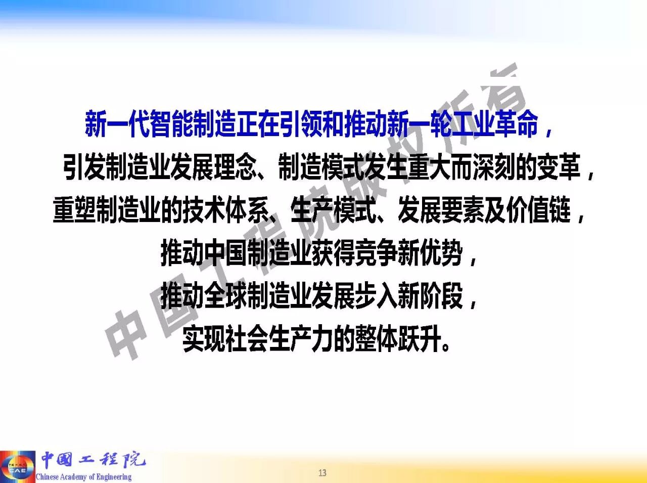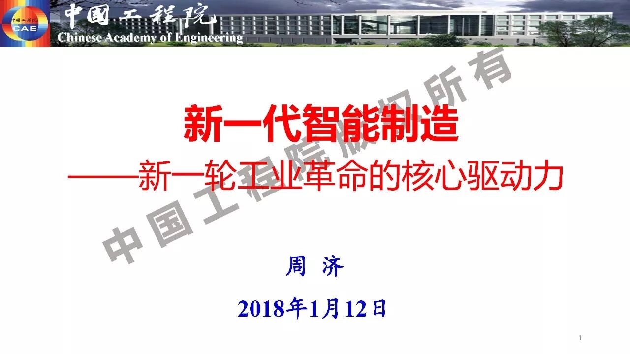 1月12日,由中国机械工程学会、中国汽车工程学会、中国电工技术学会、中国仪器仪表学会、中国农业机械学会等五学会联合主办的“迎春报告会”在中国工程院报告厅举办,中国工程院周济院长做主题报告,报告题目“新一代智能制造——新一轮工业革命的核心驱动力”。报告长达209页,全面阐述了新一代智能制造引领和推动新一轮工业革命。