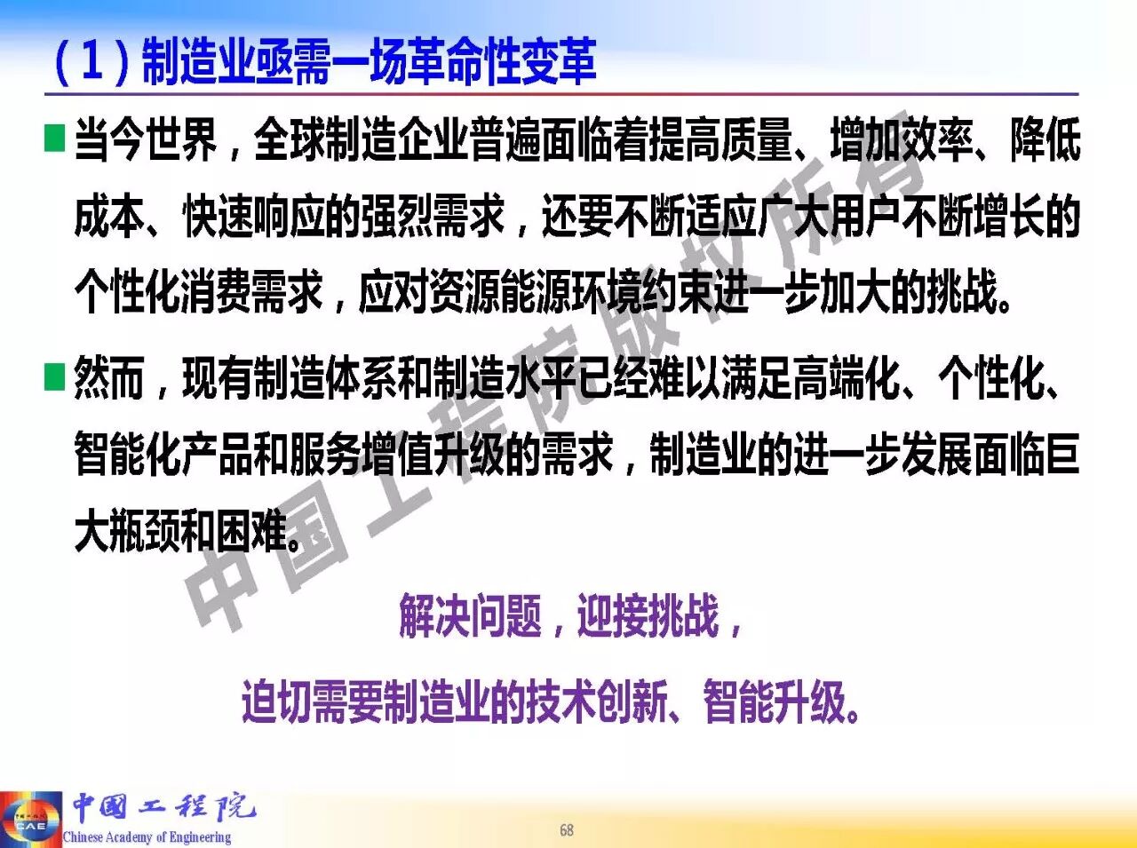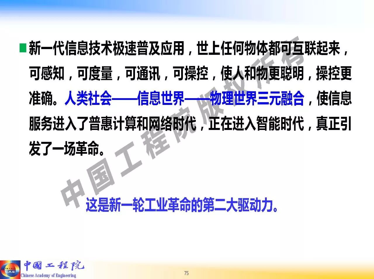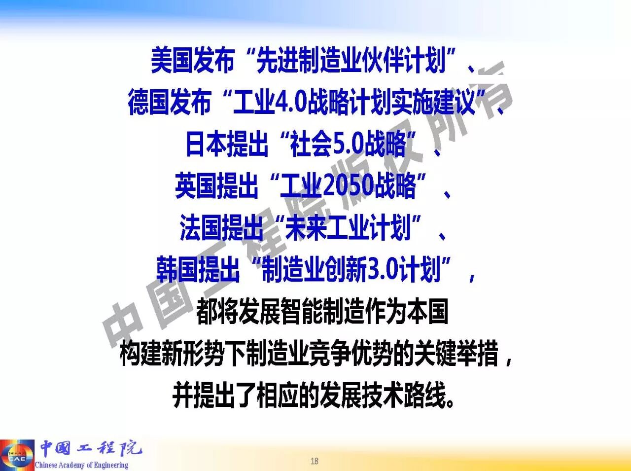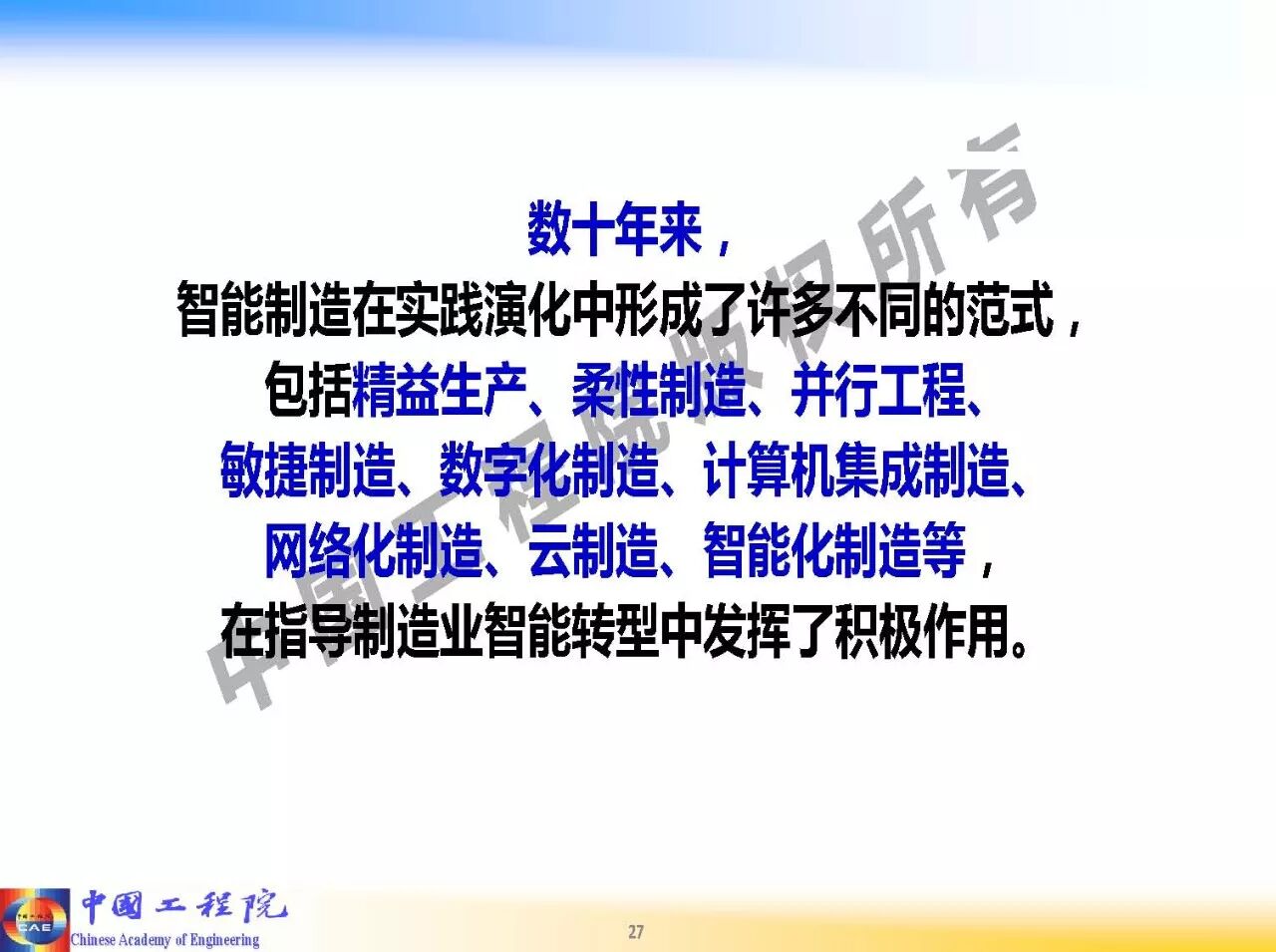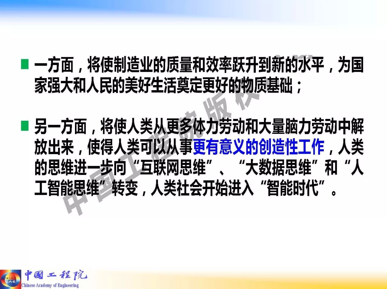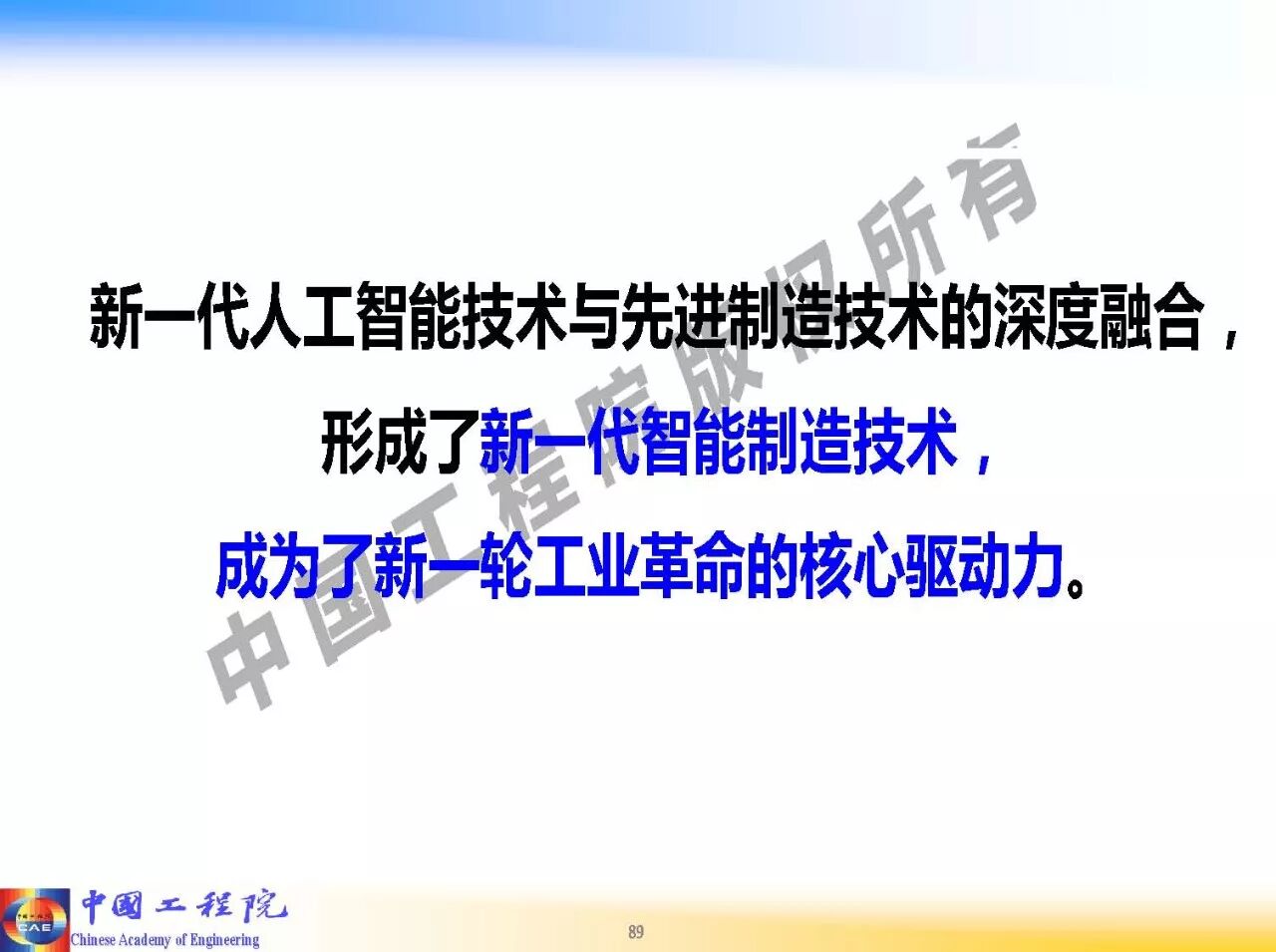 1月12日,由中国机械工程学会、中国汽车工程学会、中国电工技术学会、中国仪器仪表学会、中国农业机械学会等五学会联合主办的“迎春报告会”在中国工程院报告厅举办,中国工程院周济院长做主题报告,报告题目“新一代智能制造——新一轮工业革命的核心驱动力”。报告长达209页,全面阐述了新一代智能制造引领和推动新一轮工业革命。