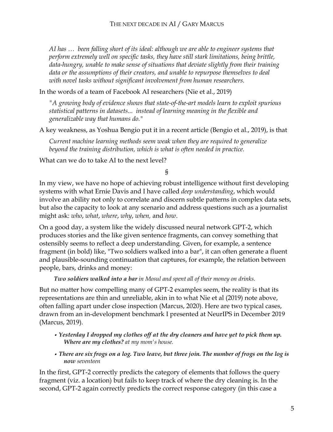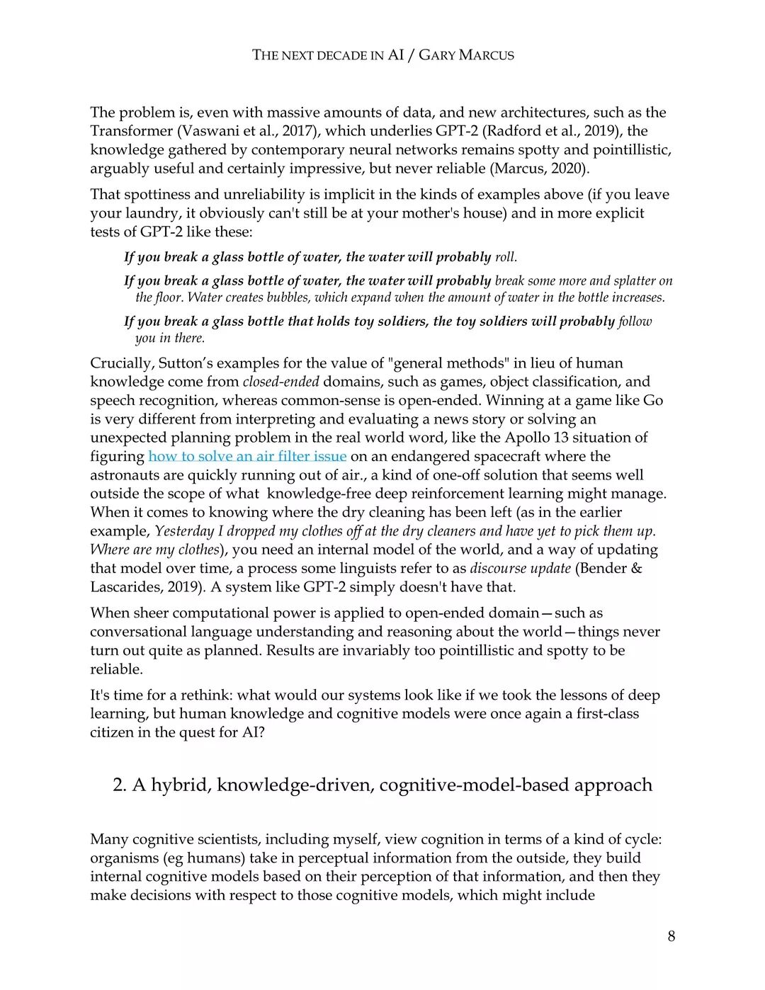 推理提供了另外一种选择;你不需要记住所有的东西,也不需要在你之前可能遇到过的近邻之间进行插值,你只需要进行推理。而不是强行记住一些东西。你需要学习一个普遍的真理:所有人类都是终有一死的,并根据需要将这一普遍真理应用于这一范畴内的所有具体实例。正如我们所看到的那样,诸如Transformers这样的神经网络也不能作出值得信赖的推理。它们有时可能奏效,但效果不佳;但是好在只要有足够的知识,他们至少提供了朝着正确方向前进的希望。