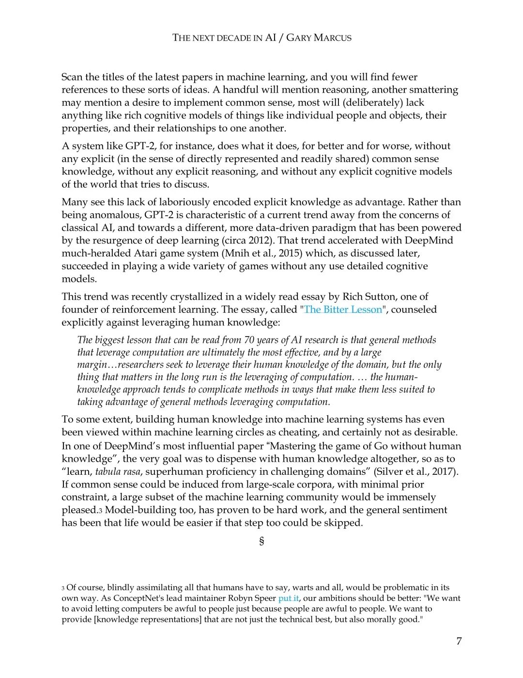 深度学习向我们展示了从大量数据中可以学到多少有用的东西。同现统计和类似的统计可能只是可靠知识的影子,但肯定有很多类似影子,也许我们可以利用这些影子。只要我们敏锐地意识到它们的长处和局限性就可以掌握更加复杂的技术。