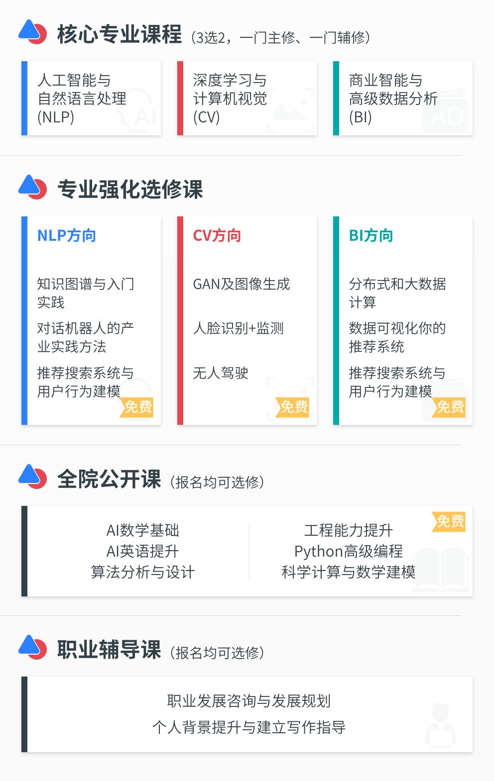 为满足不同基础学员需求,更有丰富的人工智能专业选修课及全院公开课帮助学员全面提升。