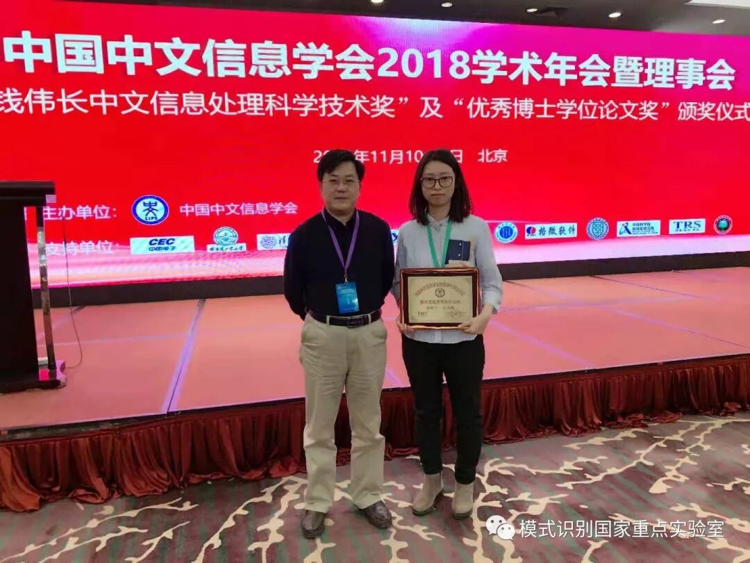 2018年11月10-11日,中国中文信息学会2018学术年会暨理事会在北京隆重举行,会上颁发了“钱伟长中文信息处理科学技术奖”、“青年创新奖”以及中国中文信息学会“优秀博士学位论文奖”。经过评奖办公室和相关领域专家评审组的初审、终审、公示后, 中科院自动化所模式识别国家重点实验室自然语言处理研究组喜获“钱伟长中文信息处理科学技术奖”一等奖、“汉王青年创新奖”、“拓尔思优秀博士学位论文奖”等多项大奖。