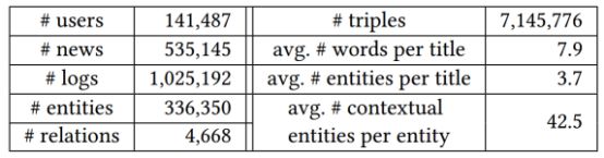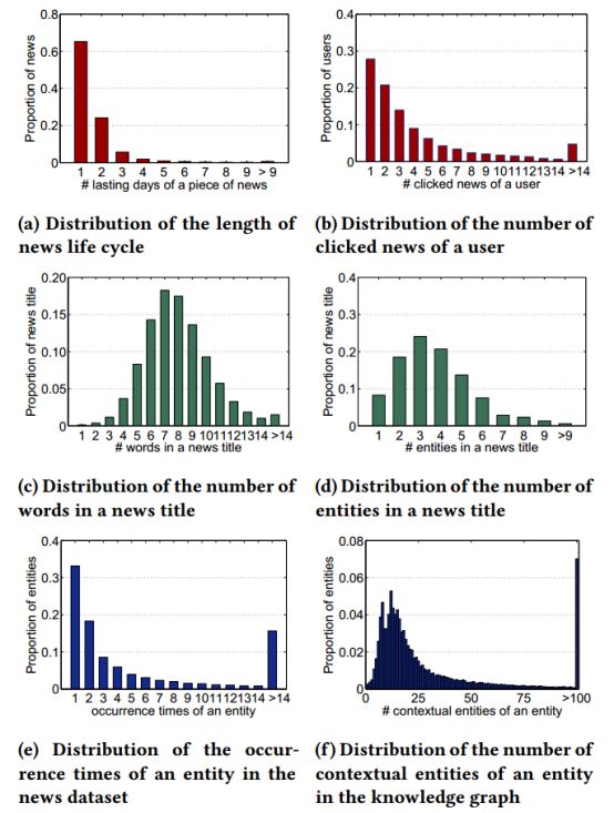 本文的数据集来自Bing新闻的服务器日志。每一段日志主要包含时间戳、用户id、新闻url、新闻标题和单击计数(0表示不点击,1表示单击)。作者收集了一个随机抽样平衡数据集,从2016年10月16日到2017年6月11日作为训练集,从2017年6月12-8月11作为测试集。使用的知识图谱数据是Microsoft Satori。新闻数据集和提取的知识图的基本统计和分布分别见表1和图3。