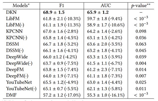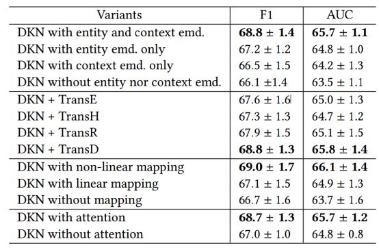 不同模型的实验结果对比如表2所示,从表中可以看出,DKN在F1-score和AUC两个指标上,都超过了作为baseline的LibFM,DeepFM,DSSM等模型。另外,针对DKN不同的配置,作者也做了对比实验,见表3。