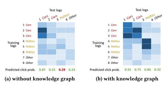 作者使用全部的训练数据来训练DKN的全特征和没有实体或上下文嵌入的DKN,然后将该用户的每一对可能的训练日志和测试日志提供给这两个经过训练的模型,并获得它们的注意网络的输出值。结果如图4所示,较深的蓝色表示更大的注意力值。从图8(a)中可以观察到,测试日志中的第一个标题与训练日志中的“Cars”有很高的注意力值,因为它们有相同的单词“Tesla”,但是第二个标题的结果不太令人满意,因为第二个标题与训练集中的任何标题,包括第1-3号,没有明确的词汇相似性。在测试日志的第三个标题中,情况类似。相比之下,在图8b中,我们看到注意网络精确地捕捉了两个类别“Cars”和“Politics”之间的关联性。这是因为在知识图谱中,“General Motors”和“Ford Inc.”与“Tesla Inc.”和“Elon Musk”分享了大量的上下文。