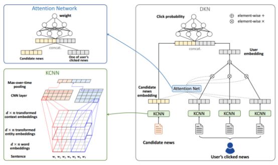 DKN的框架如图2所示,DKN以一条候选新闻和一条用户点击的新闻作为输入,每条新闻都使用一个专门设计的KNCC来处理其标题并生成嵌入向量。通过KNCC,我们得到了一组用户点击历史的嵌入向量,为了得到用户关于当前候选新闻的嵌入,作者使用一种基于注意力的方法,自动地将候选新闻匹配到其点击新闻的每一段,并用不同的权重来聚合用户的历史兴趣。