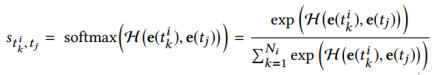 注意网络如图2左上部分所示。具体地,对于用户i点击的新闻ti和候选新闻tj,作者先将它们的嵌入连接起来,然后用一个DNNH作为注意网络和Softmax函数来计算归一化的影响力权重: