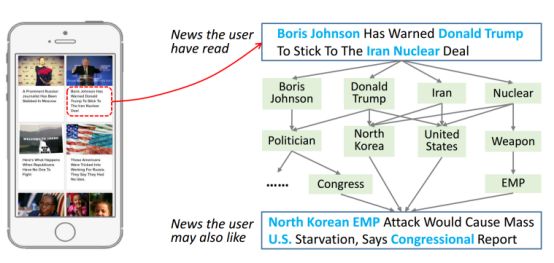 3)新闻语言通常是高度浓缩的,由大量的知识实体和共识组成。例如,如图1所示,一位用户点击一条标题为“Boris Johnson Has Warned Donald Trump To Stick To The Iran Nuclear Deal”的新闻,该新闻包含四个知识实体:“Boris Johnson”, “Donald Trump”, “Iran” 和 “Nuclear”。 事实上,用户也可能对另一条标题为“North Korean EMP Atack Would Cause Mass U.S. Starvation, Says Congressional Report”的新闻感兴趣,因为它与以往的语境知识在常识推理方面有着紧密的联系。然而,传统的语义模型或主题模型只能根据词的共现或聚类结构来判断它们之间的关联性,而很难发现它们之间潜在的知识层次的联系。因此,用户的阅读模式将被缩小到一个有限的范围,不能在现有推荐方法的基础上进行合理的扩展。