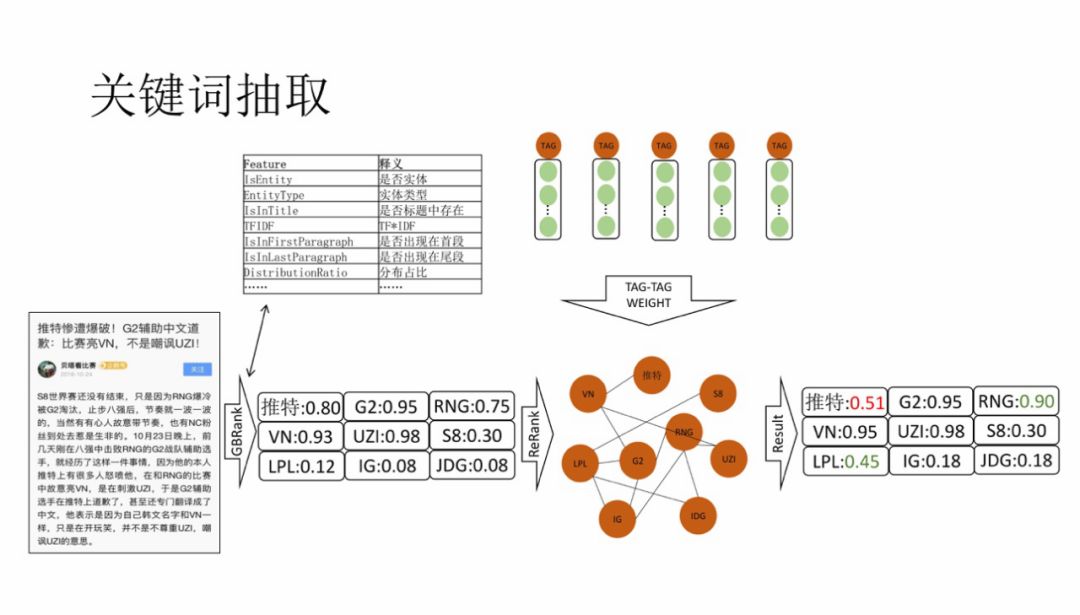 我们使用了比较传统的关键词提取思路,利用传统特征工程 + GBRank 算法排序。在实际中会遇到这样的问题,如示例,Twitter 出现在 title 中的实体,传统的方式会把 Twitter 分数计算的很高,但是这篇文章中却不是重点,重点是两支 LOL 战队的骂战。于是我们在 BGRank 之后,加了 re-rank 层,为所有的候选词做一个重排序。词之间边关系使用关联关系 embedding 计算相似度得到。