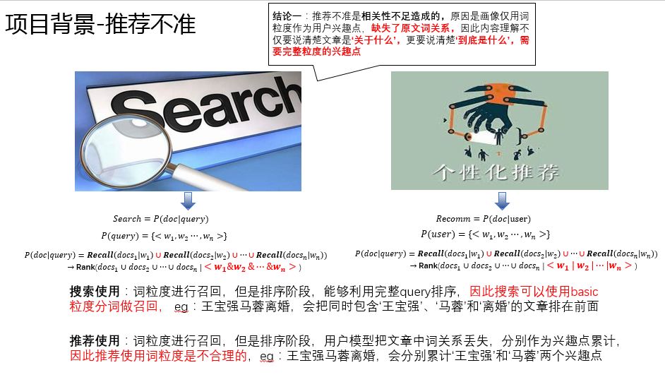 通过上述分析,我们可以得到这样的结论:搜索经过召回之后,排序有完整的上下文信息;但是在推荐中由于经过了用户画像,使用传统的内容理解方案时,排序会丢失用户阅读的上下文信息。因此,推荐对于内容理解需要保留完整的上下文,即把 "王宝强马蓉离婚" 当做一个完整的兴趣点,而不仅仅像搜索一样分别保留 "王宝强" 和 "马蓉"。