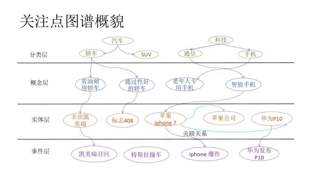 根据上述分析,我们提出了兴趣点图谱,用于解决上述个性化推荐中遇到的问题。兴趣点图谱由四层组成:分别为:分类层、概念层、实体词和事件层。下面分别介绍各层的内容: