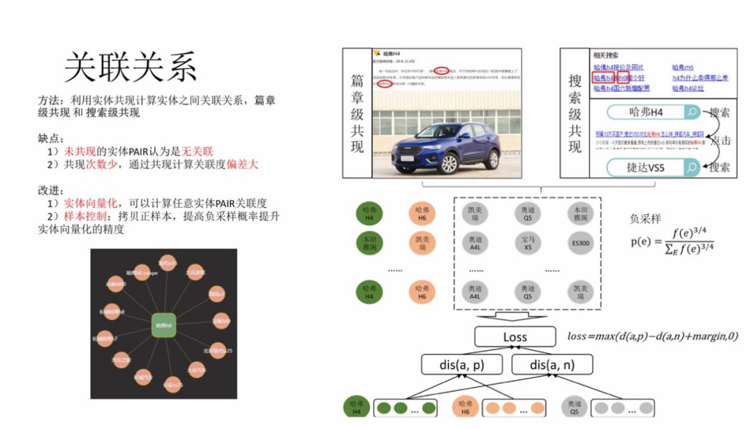 因此,需要通过实体向量化的形式克服上述问题。上述的共现数据可以作为正例,负样本采用同类实体随机负采样,正负样本比例1:3,通过 pair wise 的 loss 进行训练,得到每个实体的 embedding,然后计算任意两个实体的关联度。