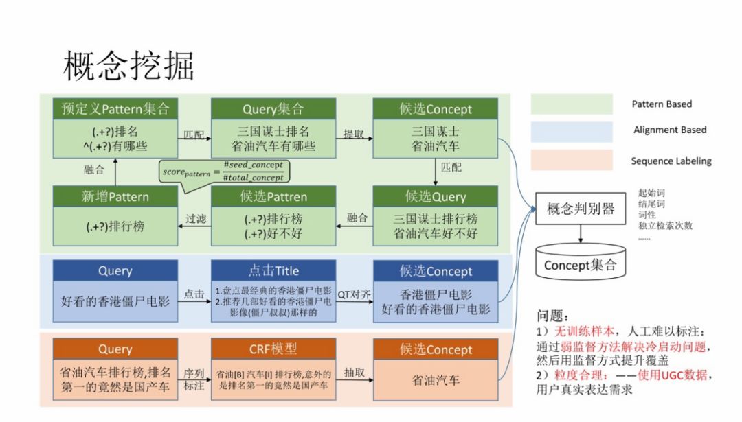 挖掘概念使用的是搜索数据,每一个概念都有多个点击的网页,对网页进行实体抽取,然后统计实体和概念的共现频次就可以获得较为准确的上下位关系,我们在 KDD 的 paper 中有详细的介绍,这里就不再重复。