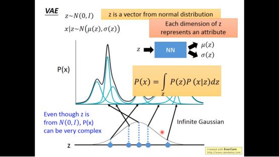 下图Z上的每一个点对应一个Gaussian,这个点对应什么样的Gaussian,是由某一个function(neural network)所决定的,总共有无穷多个高斯分布。纵使z是从一个正态分布上采样的,所表示的函数P(X)依然可以很复杂