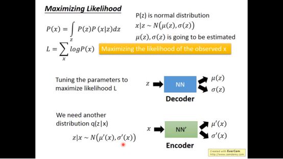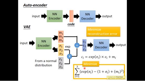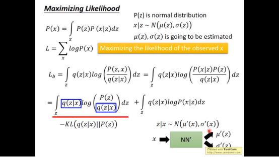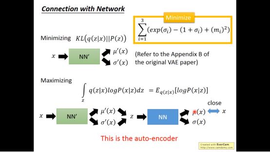 最大化Lb,也就是最小化KL(q(z|x)||P(z))。我们能做的就是调q对应的NN’,使得产生的distribution和normal distribution(P(z))越接近越好。具体推导在VAE的原始paper。实际上,minimize黄色方框的项就是minimize KL(q(z|x)||P(z))。而maximize Lb的另外一项实际上就是auto-encoder在做的事情。因为gaussion分布在mean地方概率最大,所以要求anto-encoder输出和x越接近越好。