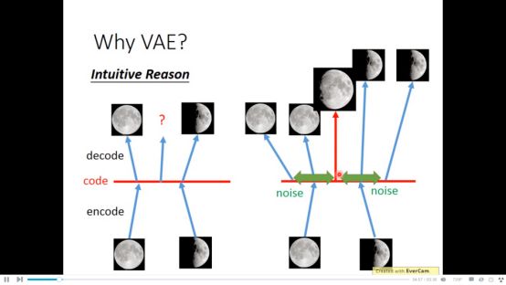 但当我们加上噪声后。满月对应在code上是一个区域,中间的code既需要生成满月也需要生成半月,怎么办,只有minimize error,生成两个之间的图,也就是介于满月和半月之间的图