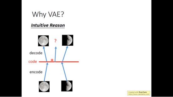 为什么VAE要设计成这样的结构呢,我们可以先有直觉的解释。下图中code有两张图,一个满月一个半月,但中间的点不一定产生半月和满月之间的图,因为函数是nonlinear的