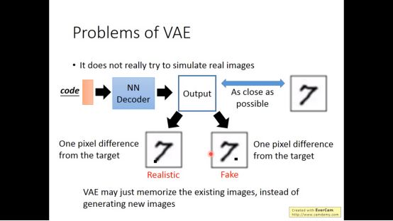 但VAE也有缺点,例如对于下图,对VAE来说,两张照片只是一个像素点的差异,因为VAE从来没有学过产生新的image,唯一做的事情只有模仿而已。