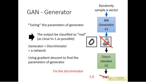 而对于generator来说就是简单的利用梯度下降方法来调参数。