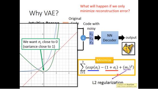 对于VAE中,minimize的第二项,我们可以把它分为两部分看待,左边两个式子是第一部分,最右边的式子是第二部分。第一部分当参数等于0时最低,这时候variance等于1,噪声为0。第二部分的Mi^2相等于L2regularzation,避免overfitting。