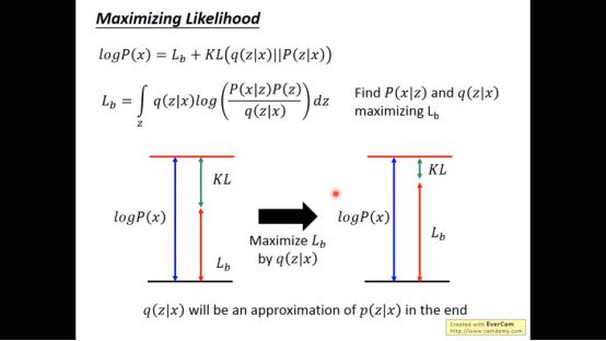 这时候logP(x)的值是Lb和KL(q(z|x)||P(z|x))求和得到。我们调整q(z|x)使得Lb最大。最终q(z|x)的分布会和p(z|x)相同。最终得到的结果是Lb越大,logP(x)越大