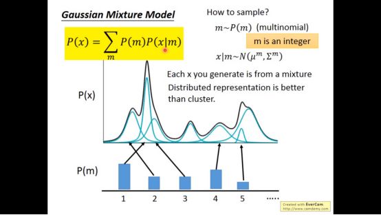 这里我们要引入Gaussian Mixture Model的概念,Gaussian Mixture Model的核心思想是很复杂的distribution是由好多Gaussian分布和不同的weight结合起来的结果,只要Gaussian分布数目足够多,就可以产生复杂的distribution