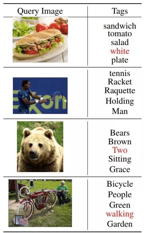 一般而言,检索到的关键词很好地描述了查询图像。但是,我们可以识别一些错误(红色)。例如,在最后一个例子中,“walking”一词被错误地检索出来。我们认为这可能是由于训练集中有很多图像同时包含“people”和“walking”。