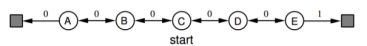 状态空间:如下图:A、B、C、D、E为中间状态,C同时作为起始状态。灰色方格表示终止状态;