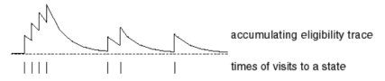 该图横坐标是时间,横坐标下有竖线的位置代表当前进入了状态 s,纵坐标是效用追踪值E 。可以看出当某一状态连续出现,E值会在一定衰减的基础上有一个单位数值的提高,此时将增加该状态对于最终收获贡献的比重,因而在更新该状态价值的时候可以较多地考虑最终收获的影响。同时如果该状态距离最终状态较远,则其对最终收获的贡献越小,在更新该状态时也不需要太多的考虑最终收获。