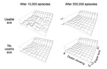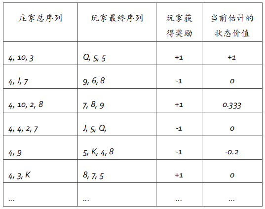 可以看到,使用只有当牌不小于20的时候才停止叫牌这个策略,前6次平均价值为0,如果玩的牌局足够多,按照这样的方法可以针对每一个状态(庄家第一张明牌,玩家手中前两张牌分值合计)都可以制作这样一张表,进而计算玩家奖励的平均值。通过结果,可以发现这个策略并不能带来很高的玩家奖励。